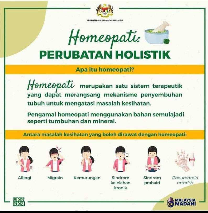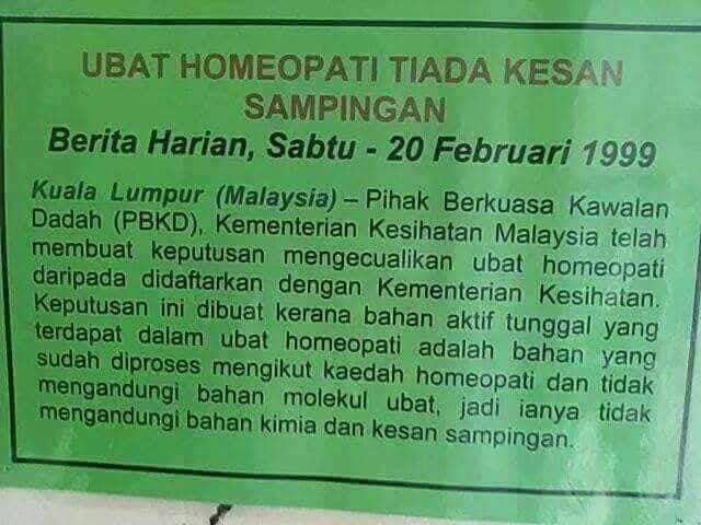 Ubatan Homeopati tidak memerlukan sebarang Pengesahan daripada KKM kerana bahannya tidak mempunyai sebarang Bahan-bahan Kimia atau Dadah yang Terjadual . Walaupun begitu , KKM telah mengesahkan akan Keselamatan Homepati pada Artikel yang telah dikeluarkan sejak Tahun 90-an lagi .