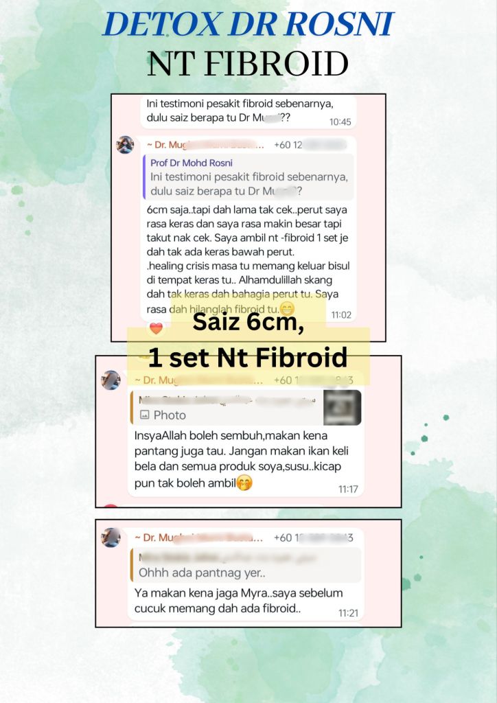 Puan Dr.M mengalami sakit Fibroid sejak sekian lama. Beliau mulakan dengan Detox Dr Rosni selama 3 bulan (3 set detox) dan kemudian diikuti dengan remedi khas NT FIBROID.